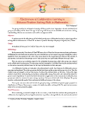 Effectiveness of Collaborative Learning to Enhance Problem Solving Skills in Mathematics T.V.S. Prakasarao* Te group members in collaborative learning will have positive inter-dependence wherein individual and group accountability will be found. Te type of learning will enhance the social skills such as decision making, trust building, efective communication and confict management skills. Objective: A study to examine the efectiveness of individual learning verus collaborative learning in enhancing problem solving skills in Mathematics of Class VIII students of Jawahar Navodaya Vidyalaya Deogarh (Dist.) Orissa. Sample 38 students (25 Boys and 13 Girls) of Class VIII of J. N.V. Deogarh Methodology: In the present study 38 students of Class VIII were selected. Based on their previous academic performance in Mathematics and classroom interaction they were divided into two heterogeneous groups. Initially the teacher taught the lesson mensuration to the entire class. It was based on the measurement of volume of the cuboids. A pre-test was conducted and the average score of each group was not signifcantly diferent from each other. Next one group was randomly assigned to the individual learning group, while other group was assigned to the collaborative learning group. Te two groups worked separately. In individual learning the students worked on the various numerical problems based on the topic by themselves at their own pace. In collaborative learning an instruction sheet that pointed out the key elements of collaborative process was given and explained. Te entire group was divided into three smaller groups with group size of six. Ten the students were encouraged to discuss the process of solving the problems given on the topic. During this stage students shared their understanding and problem-solving skills among themselves and collectively solved the given numerical problems. To attain frst hand information on application of the mensuration in daily life, these groups were asked to measure the water-storage capacity of the open cubiod tank of the Vidyalaya. Te group members enthusiastically applied their mathematical skills and measured the volume. Ten a post-test was conducted for both the groups by using a well balanced question paper prepared on classifcation of Blooms Taxonomy, to measure the students problem-solving skills. Te post-test scores were subjected to necessary stastical analysis. Result Discussions: After conducting a statistical analysis on the test scores , it was found that students who participated in collaborative learning had performed signifcantly better on problem-solving skills than the students who studied * Principal, Jawahar Navodaya Vidyalaya, Deogarh, Odisha 24 Collaborative Learning